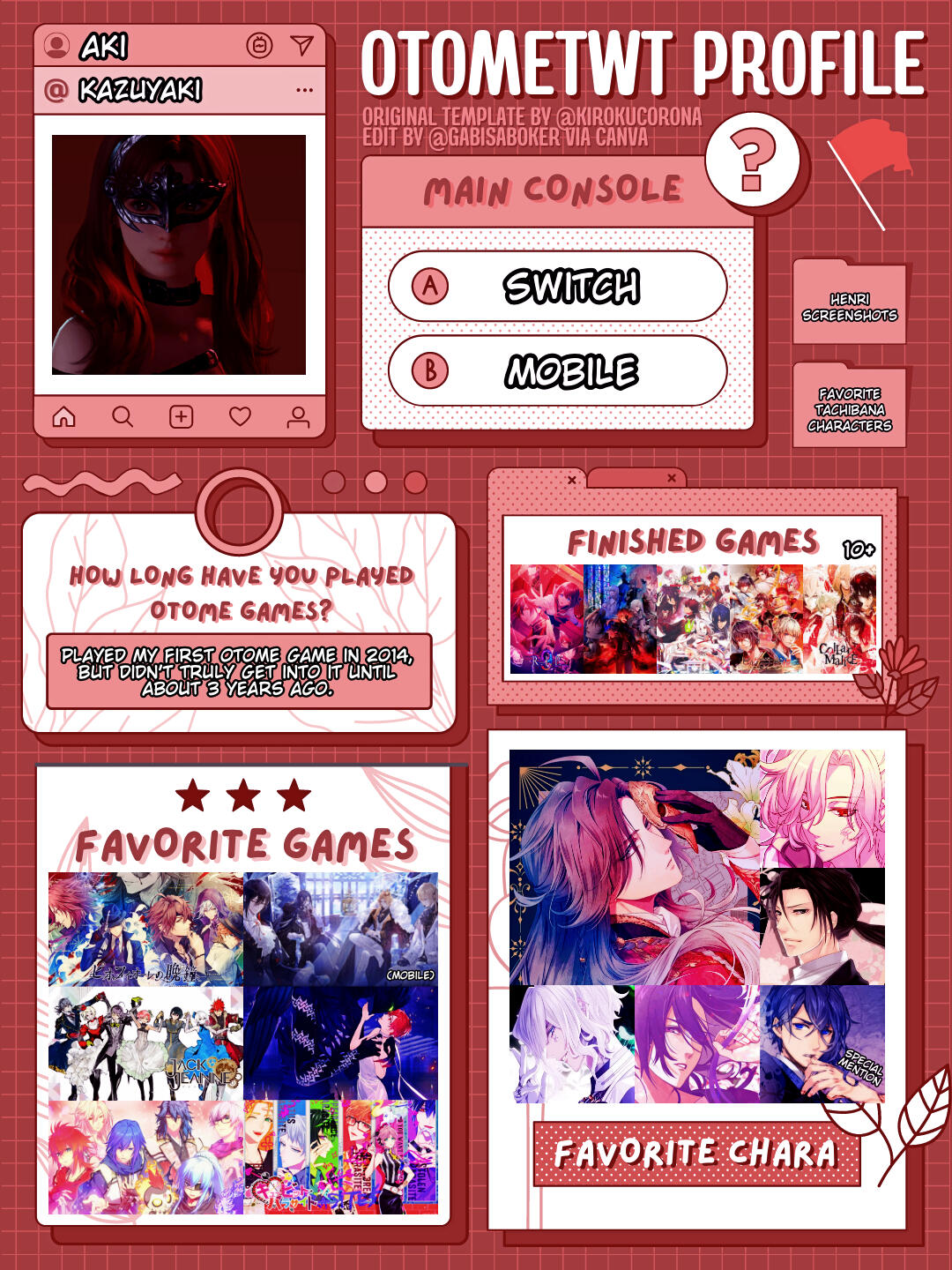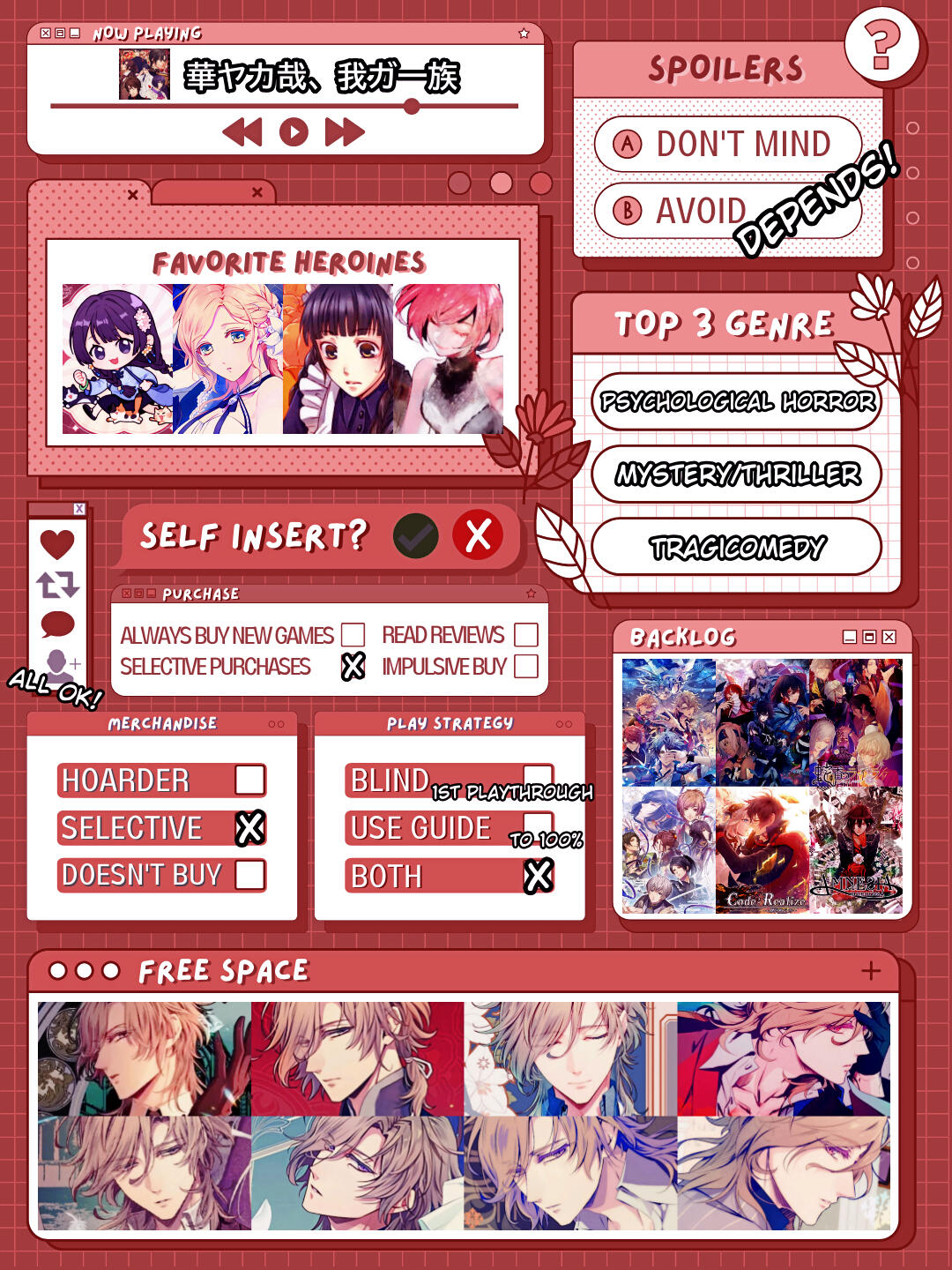 Multi-fandom and not spoiler-free. As for otome games, I will tag accordingly (no big spoiler or CG spam).Aside from shippy art and occasional shitposting, my account is pretty much nsfw-free.